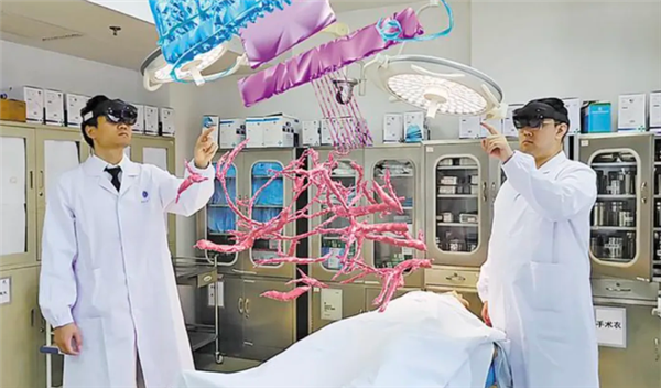 发布现场,团队成员戴上MR眼镜后,实验大鼠的脑部全息投影成像,精准地“悬浮”在眼前,不同颜色标注的脑组织功能区与红色血管组织交织,手指悬空轻触全息影像即可进行数百倍的放大呈现特定脑区,旋转、移动图像,解剖结构关系一目了然。