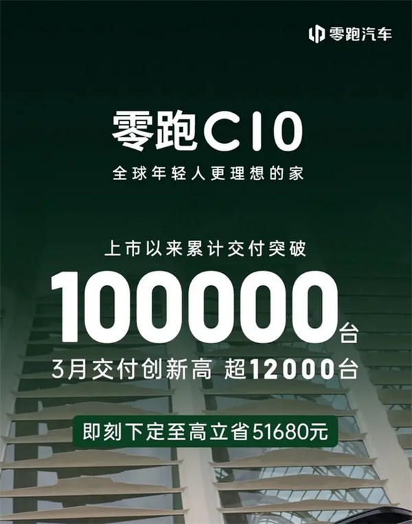 快科技4月2日消息,零跑汽车宣布零跑C10累计交付突破10万台,3月交付超1.2万台。
