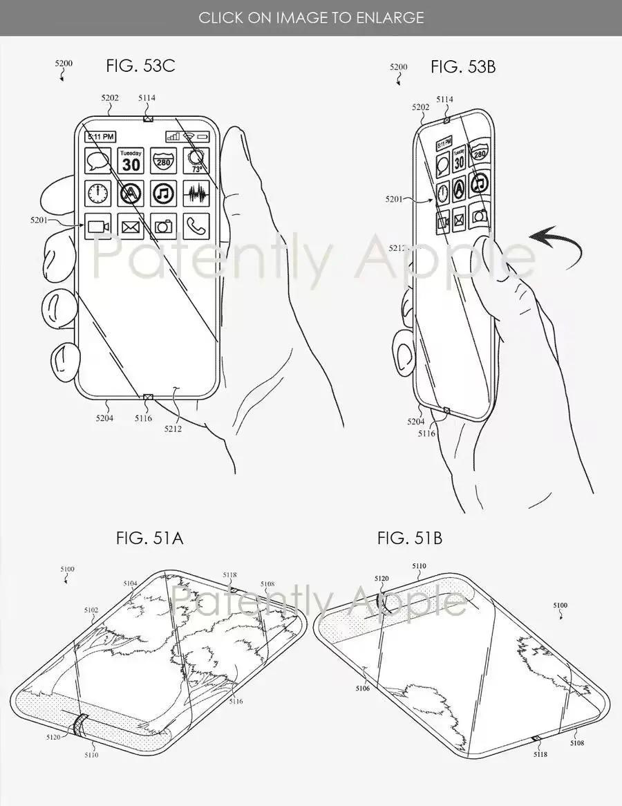 专利图示披露了多项创新设计:图26A-26C展示六面透明棱柱外壳,每面均可独立显示内容;图53B-C演示手机翻转时,界面会智能迁移至用户正对屏幕;图51A-B则呈现了画面从正面延伸至背部的“穿透显示”效果。