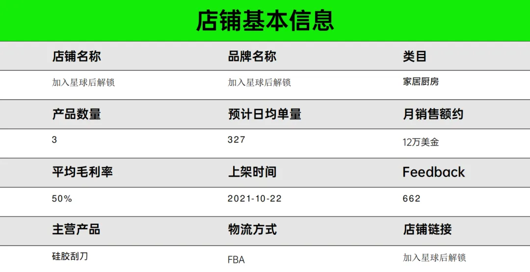 此次我们要分析的店铺产品数量有3个,预计日均出单约327单,月销售额约12万美金。店铺爆款于2021年10月上架,平均毛利约50%,从亚马逊展示的销量数据看,过去1个月里至少出了2000+订单。店铺feedback近30天增长18个,累计有662个。