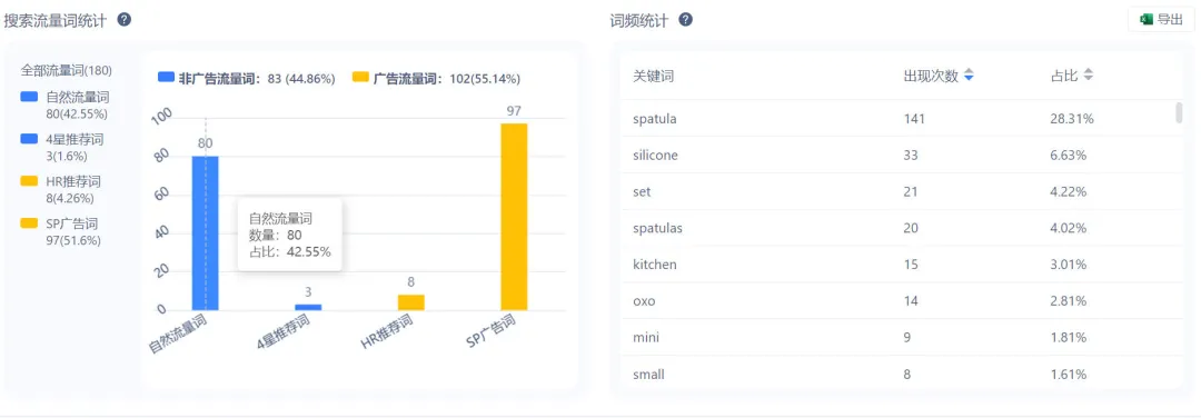 AMZ123获悉,店铺的主要流量来源集中在搜索流量+关联流量+站外推广。通过工具查询后发现,店铺在近1个月里为爆款投入了约400+关键词,进入了搜索前3页的词共计有180个。其中自然搜索流量占比在42%,广告流量占比在55%,两者占比平衡,算是理想状态。