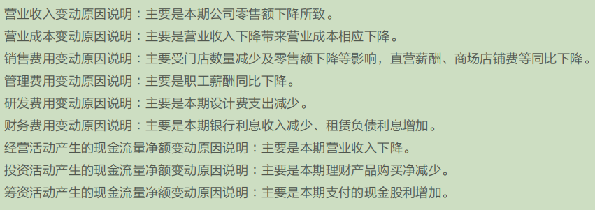 而作为上市公司的年报,通常对于全年业绩的增长或者下滑,都会向投资者给出一些理由解释,但太平鸟2024年报中对此没有给出只言片语,只是对于营业收入、营业成本、销售费用、现金流等科目的变动原因简单说明“销售额下降”。