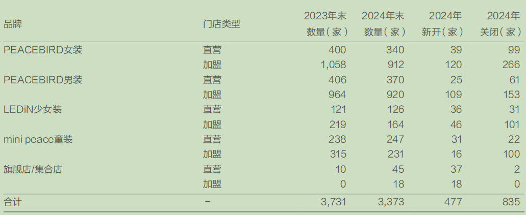 太平鸟在年报中,要“持续优化渠道结构”,聚焦门店经营质量提升和盈利能力改善,持续关闭低效门店,经营重点转向提升终端品牌形象和门店平效。直接体现就是门店数量大幅缩减,2024年末所有实体门店数为3373家,这是自2020年以来门店数最少的一年。