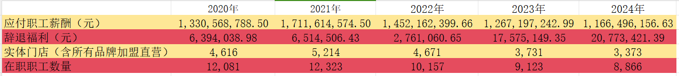 照此理解,太平鸟2024年辞退员工花费超过2000万元。而把时间跨度拉长到5年,从2020年开始计算的话,2024年是太平鸟近5年来门店数最少、在职员工数量最少、应付职工薪酬最少、辞退员工花费最多的一年。