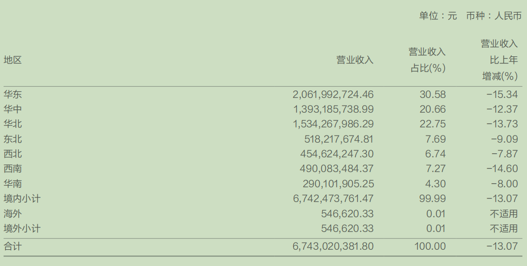 而东西南北中所有区域的营收,也是同比下降,尤其是大本营华东地区,虽然营收占比还是第一位,但下降比例为15.34%排到第一。