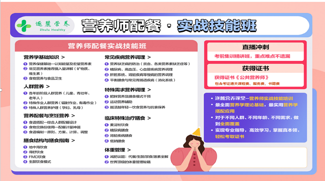 作为武汉逐麓科技的主营业务,公共营养师培训项目以国家职业标准为基础,结合市场需求与行业发展趋势,打造了一套科学化、系统化、实战化的课程体系,涵盖营养学基础、膳食指导、慢病管理、食品安全、健康教育等核心领域。公司通过线上教学模式,增加了数百个贴近生活的案例,力求减少营养知识点的复杂性,让更多的人都能理解学会营养知识。为学员提供灵活高效的学习体验,帮助其掌握公共营养师的核心技能,并通过权威认证考试,获得职业资格。