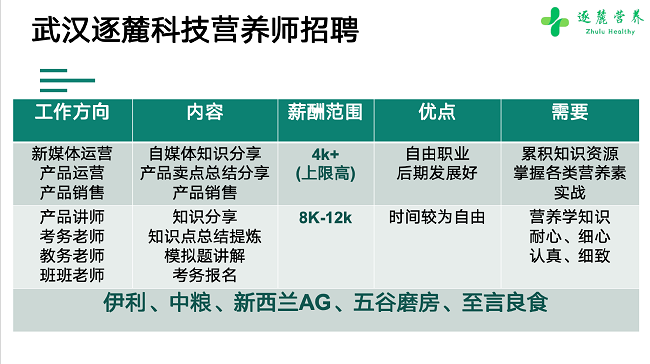 比如,PPT科普讲座、提供营养咨询指导(减重、控糖等营养服务案例)、运营科普自媒体、撰写营养科普书、开发营养课程、分享/销售营养相关产品和开展项目合作,以及找到专职或兼职营养师工作等等,都是武汉逐麓科技在课程体系设置时综合考虑的要点。