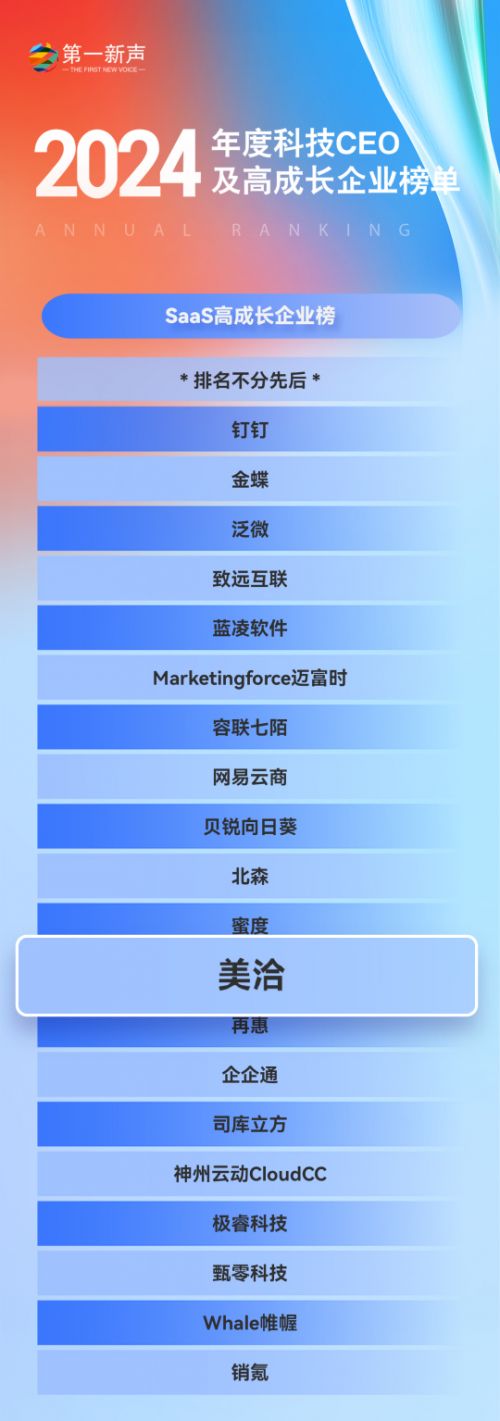 近日,第一新声发布《2024年度科技行业最佳CEO及高成长企业榜单》,美洽凭借“AI技术创新力”与“SaaS领域高成长性”,登榜“2024年度中国SaaS高成长企业”。