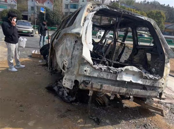 从现场图片看,起火的车辆是一台三排六座的SUV,起火点位于车头,最终整车被完全烧毁,只剩下骨架。