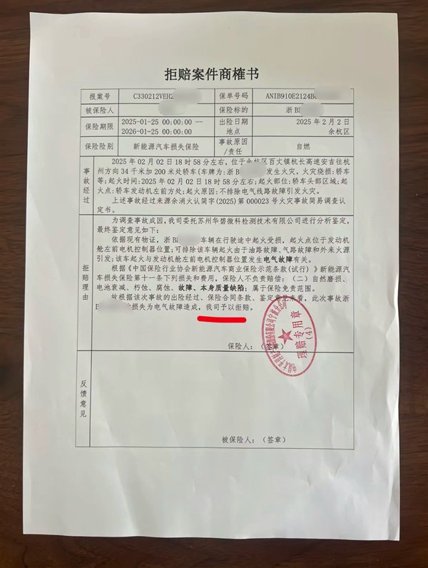 而从保险公司出具的“拒赔案件商榷书”中可以看到,此事发生在今年2月2日18时58分左右,事故原因标明“自燃”,起火部位为头部区域,具体就是发动机左前方,起火原因显示为“不排除电气线路故障引发火灾”。