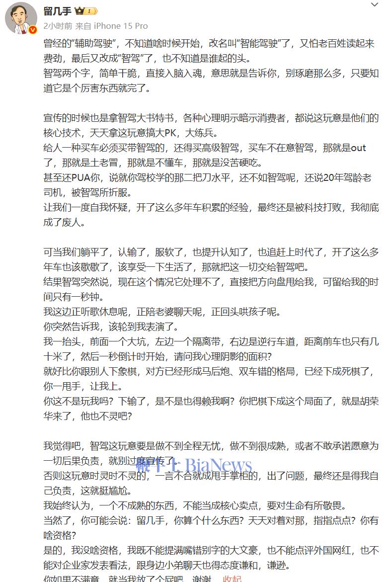 留几手认为,智驾要是做不到全程无忧,做不到很成熟,或者不敢承诺愿意为一切后果负责,就别过度宣传了。