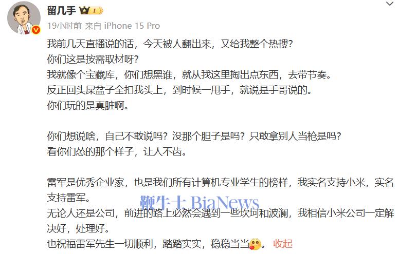 此前,留几手曾在直播中表示,“雷军现在人设拔得有点太高了,雷军现在整得有点高处不胜寒,我觉得挺危险。”