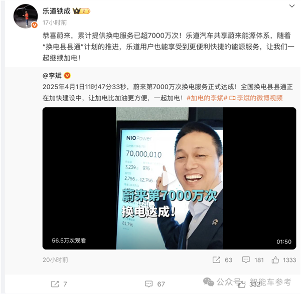 虽然有用户预计艾铁成会辞职,但其的离开还是显得突然了一些,就在昨天,蔚来达成7000万次换电时,艾铁成还转发微博表示: