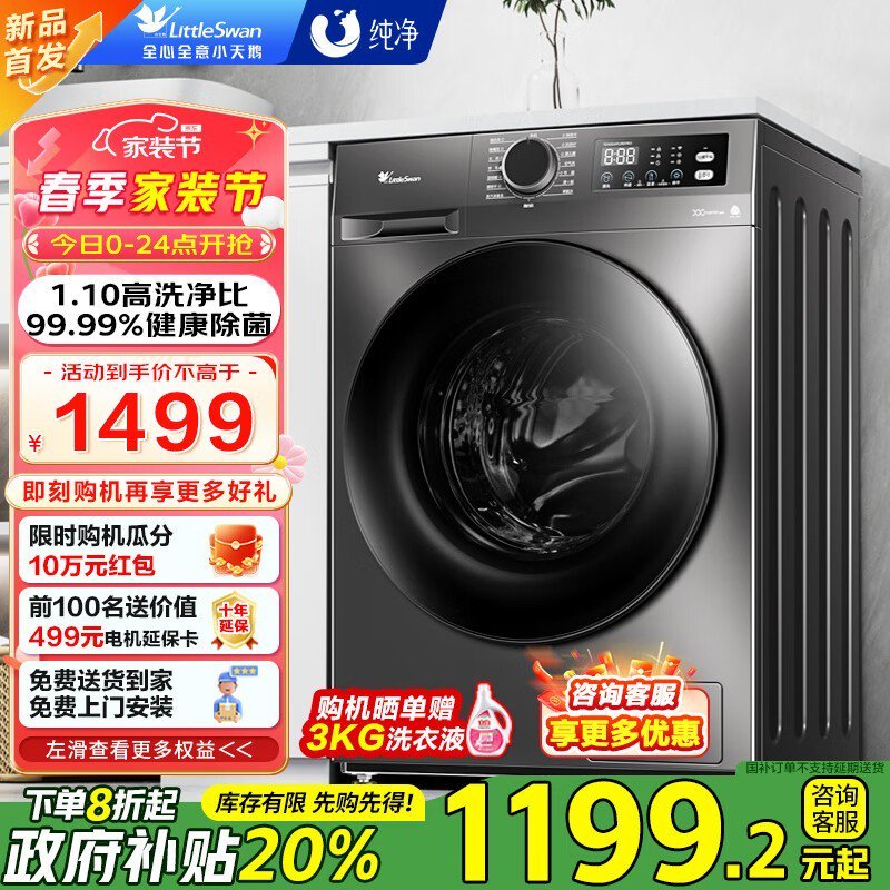 小天鹅变频滚筒洗衣机10kg大容量智能洗涤仅1069元