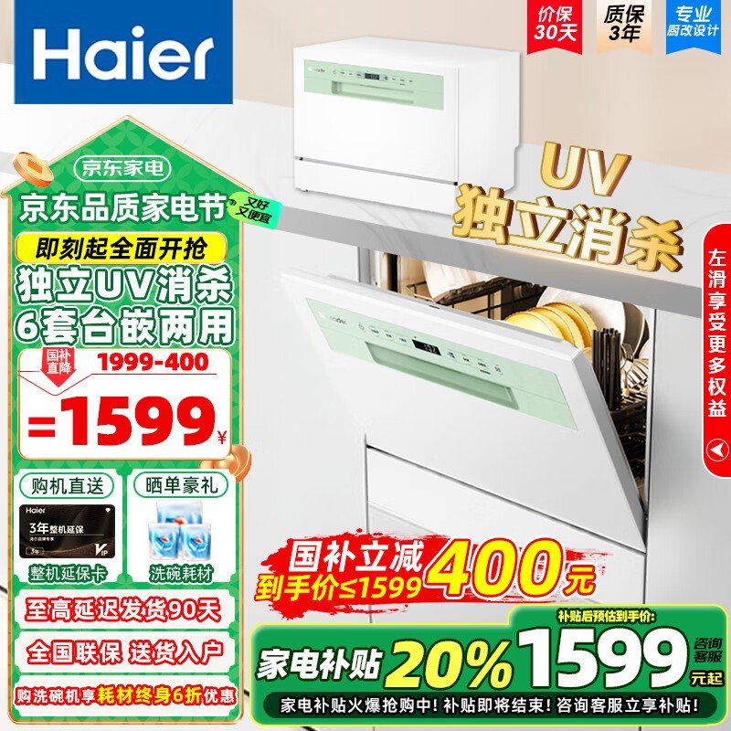 海尔小方糖洗碗机6套,到手价1240元