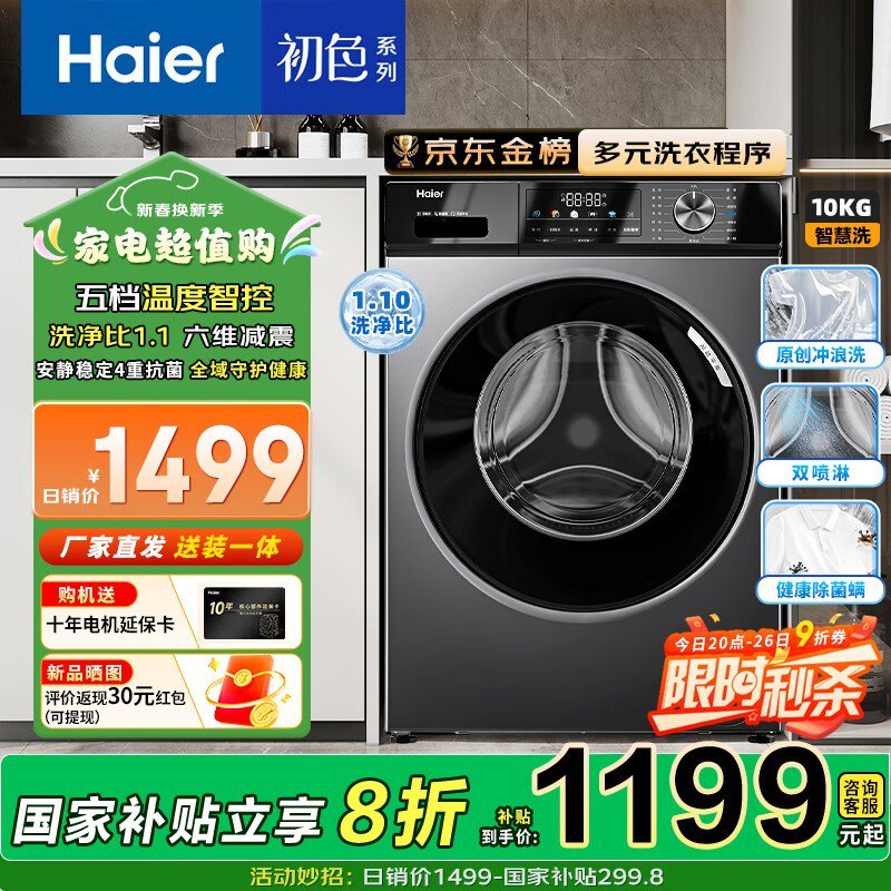 海尔初色系列10KG洗衣机京东优惠价1148元