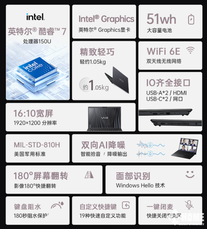 VAIO S13 2025拥有仅1.05kg的轻薄机身;顶部带有金属饰条,不仅起到了装饰的作用,还承担着强化了整体材质刚性的辅助作用;配备了铝合金键盘面,搭配下沉式转轴设计,开启屏幕后键盘后部自动抬升形成符合人体工学的黄金输入角度;通过了MIL-STD-810H级质量测试。配备92万像素前置摄像头(带物理隐私开关)和AI降噪麦克风,支持Windows Hello技术,共有4种降噪模式可选; 该款轻薄本配备了双USB-C接口、双USB-A接口、一个HDMI接口、一个LAN口、以及音频插孔等。