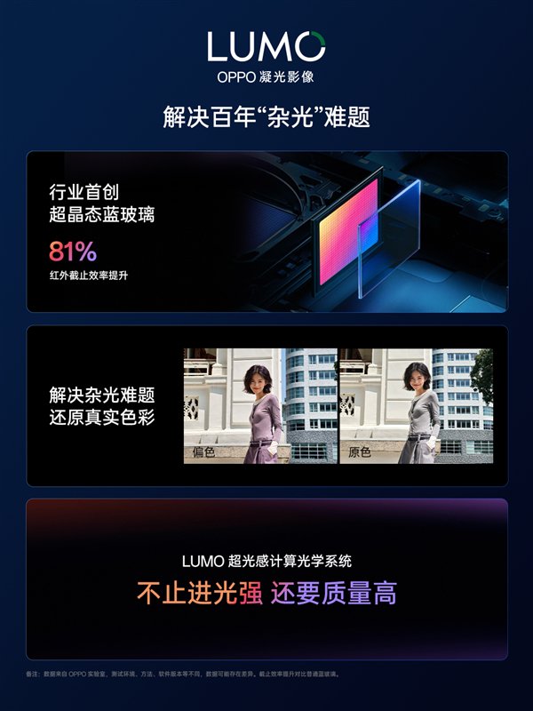 这一镜头还集成OPPO首创的超晶态蓝玻璃,红外截止效率相比传统蓝玻璃提升 81%,大幅提升了其色彩还原表现,在人像拍摄时可以精准还原服装原有的色彩。