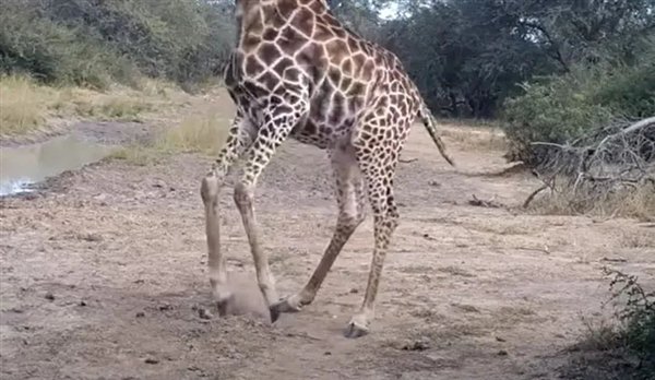上面这个是一只长颈鹿在听到人的谈话声时的反应,它还没来得及喝一口水,拔腿就跑。