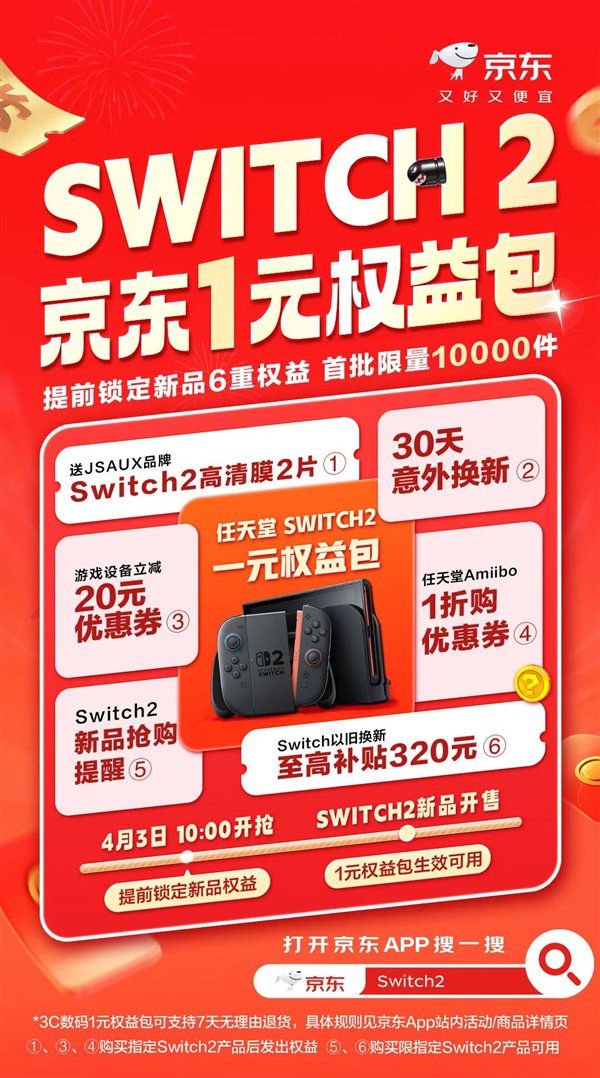京东宣布,Switch2自营预约即将开启,在这之前给大家准备好了一系列换新福利“Switch 2 京东1元权益包”,1元即享6大超值权益。