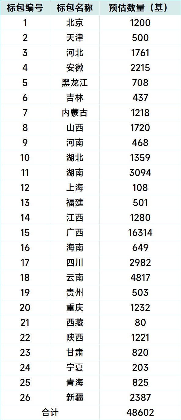 本招标共分26个标包,包括北京、天津、河北等26个省市,预估采购数量共48602基。