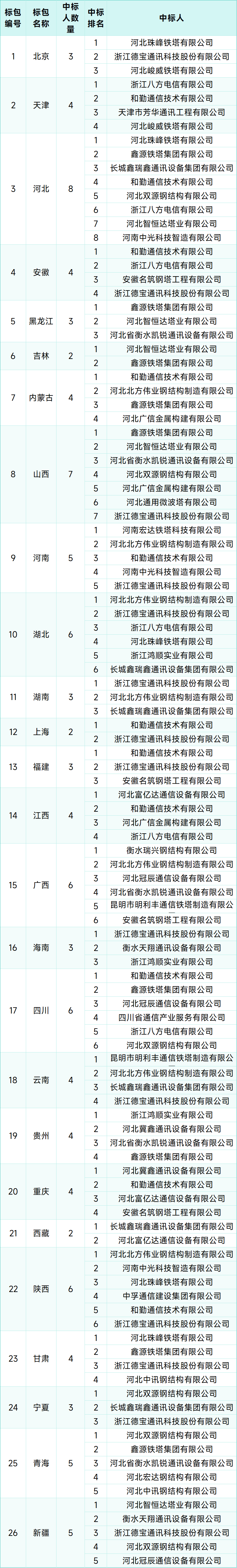 经C114统计,本项目一共有28家厂商中标,其中,浙江德宝通讯科技股份有限公司共中标14个标包,和勤通信技术有限公司中标11个标包,鑫源铁塔集团有限公司中标9个标包,成为中标数量排名前三的厂商。