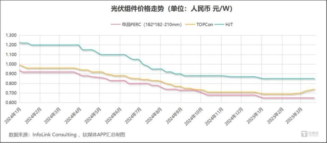 电池片:需求持续旺盛,开年以来全线上涨电池片方面,根据InfoLink公布的统计数据,早先大幅上涨但市场实际需求在走低的182-183.75mm单晶PERC电池交易均价有所回落,3月同比下降6.06%,降至0.31元/W,但年内涨幅仍然可观,为12.73%。占据市场主流的N型产品方面,182-183.75mm尺寸的TOPCon电池3月交易均价涨至0.305元/W,涨幅5.17%;最受市场青睐的182*210mm TOPCon电池全月大涨17.25%,交易均价来到0.34元/W,年内涨幅高达28.3%;210mm TOPCon电池交易均价小幅上涨1.69%,涨至0.3元/W,年内上涨5.26%。作为组件的前序产品,电池片的需求和价格走势直接受到“抢装潮”刺激,再叠加此前去产能初见成效,成为了产业链上全线普涨的环节。不过,随着近期开工复产情况增多,去产能进度放缓,再加之抢装窗口持续收窄,该环节未来价格走势不确定性也较大。首先,P型电池价格主要受印度市场需求而非国内抢装影响,随着印度P型需求退坡,价格可能持续回落。而主流N型产品方面,业内普遍认为,其价格会在节点到来前早组件一步走低。InfoLink给出的判断是电池片整体价格会在4中旬后伴随需求退坡而松动,不过该机构也提示,具体走势仍须考虑各尺寸供需情况。组件:阔别两年的涨价,带来的不只有惊喜作为光伏电站的核心设备,组件是制造链上的终端产品,其价格走势往往直接体现着市场供需情况和利润空间。自光伏行业产能过剩加剧,持续遭遇“降价潮”以来,该环节价格也是“易跌难涨”的代表。“136号文”发布近半个月后,市场主流TOPCon组件交易均价终于在2月19日至2月26日当周迎来小幅上涨,而上一次涨价,还要追溯到近两年前的2023年3月15日。此后,TOPCon组件价格持续走高,涨幅也有所扩大。3月的四个周,该环节每周价格都实现上涨。截至3月底,TOPCon组件交易均价涨至0.74元/W,3月同比上涨6.47%,年内来看,受去年底至今年初价格大跌的影响,涨幅为4.23%(市场需求相对较少的PERC组件和HJT组件3月交易均价无明显变动,年内降幅在2%-5%之间)。“抢装潮”刺激下,组件涨势凶猛,有消息称,在新项目需求上,不少组件厂对低于0.75元/W的订单甚至都不愿交付,市场上出现“撕毁”已签订单要求涨价,或拖延拒绝不交货,乃至二次违约、代工厂私卖A货等乱象,行业秩序也受到影响。而上述乱象背后,正是“抢装潮”所剩时间无多,个别厂商不择手段想要“赚一笔”的心态。InfoLink判断,组件涨势或能延续至四月中下旬,而业内普遍认为,此后该环节价格会明显走低,跌幅甚至比“抢装潮”之前来得还猛烈。近期,一些行业头部公司、大佬也纷纷发声,呼吁不要为短期利益扰乱市场,应坚持自律公约的去产能节奏已达到长期稳价目的。在近期钛媒体APP参加的一场活动上,隆基绿能集团副总裁张海濛、晶澳科技光伏与储能业务群总裁祝道诚都表示,自身企业最害怕的就是当前这种非理性的涨价。张海濛表示,坚持长期主义的企业最不希望看到价格大幅波动,无论是急涨还是急跌,这种情况出现后对自身经营、对客户都是一种干扰,当务之急只能控制好自己能控制的变量,管理好生产、库存、客户交付和沟通,尽量减少干扰。祝道诚也表示,据自己观察,一线企业在价格波动中会更稳重一些,既不愿意失血做市场份额,也不愿意一味追求高价订单影响信誉,更要紧的是保持现金流水平,维持到行业产能出清完成之时。他也就此呼吁行业理性看待市场变化。更令从业者担忧的,恐怕是全年的需求情况。虽然因为上半年的抢装,部分机构调高了全年装机水平预期,但企业对此显然更加悲观,包括上述龙头企业高管在内,多认为全年装机能够与去年持平即已不易,大概率仍会走低。在需求走弱,产能出清放缓,价格持续波动的情况下,光伏的难题远非一次“抢装潮”或“涨价潮”就能解决的。