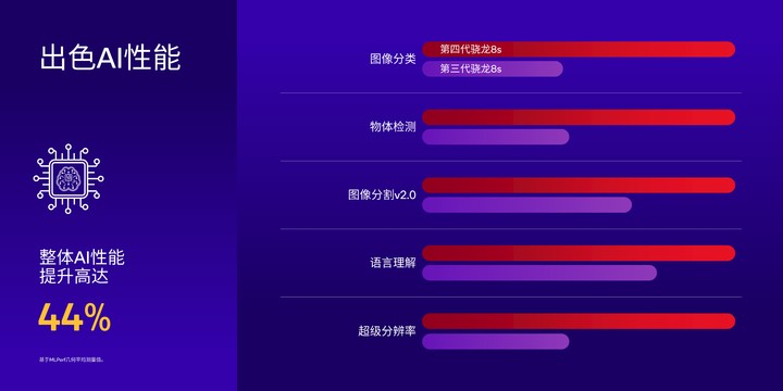 接着就是高通一直强调的 AI 性能,高通表示,得益于微架构方面的提升,第四代骁龙 8s 的 AI 性能相比前代提升达 44%。在实际用例中,从图像分类、物体检测到超级分辨率,性能提升了 25%-55%。,借助多模态生成式 AI,用户可以与 AI 智能助手进行交互,它能够理解多种输入方式,包括语音、文本和视觉图像等等。
