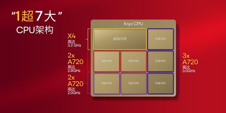 第四代骁龙 8s 移动平台的架构为「1 超 7 大」,其中包括 1 个超级大核,和 7 个性能内核。具体来看,它采用 1 个 3.2GHz 的 X4 超级内核,3 个 3.0GHz 的 A720 性能内核,2 个 2.8GHz 的 A720 性能内核,2 个 2.0GHz 的 A720 性能内核。