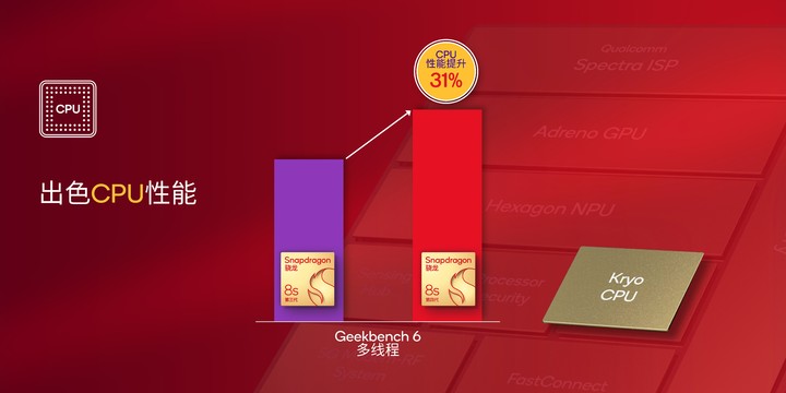 相比于第三代骁龙 8s,第四代骁龙 8s 的 CPU 性能提升高达 31%。在整体能效方面,第四代骁龙 8s 相比前代也实现了提升,在同样的对比条件下(4500mAh 电池容量),第四代骁龙 8s 测试手机相比于前代测试手机,能够让用户多打 2 小时电话,多听 1 小时音乐,或者多打 1 小时游戏。