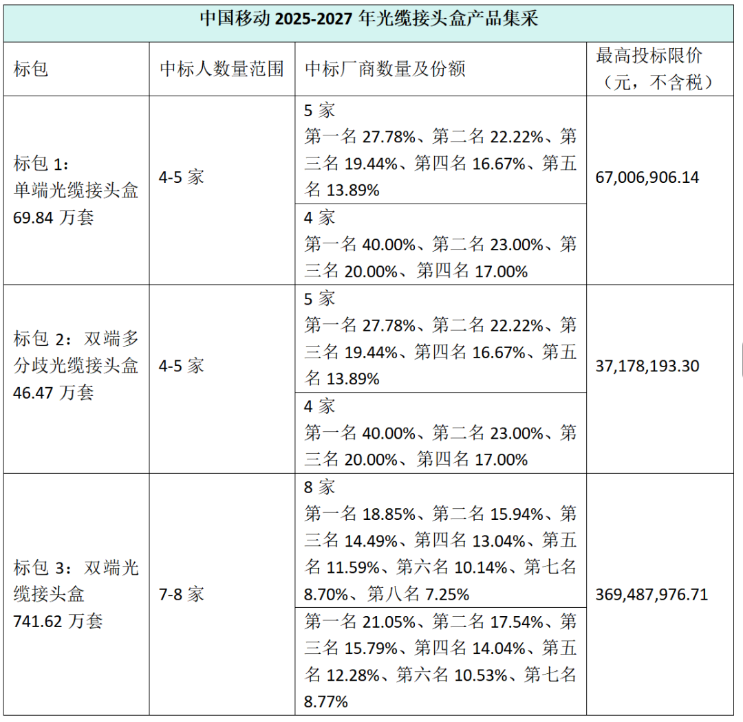 C114讯 4月3日消息(九九)中国移动采购与招标网日前发布2025-2027年光缆接头盒产品集中采购项目招标公告,预估采购规模为单端光缆接头盒69.84万套、双端多分歧光缆接头盒46.47万套、双端光缆接头盒741.62万套。预计本次采购需求满足期为2年。