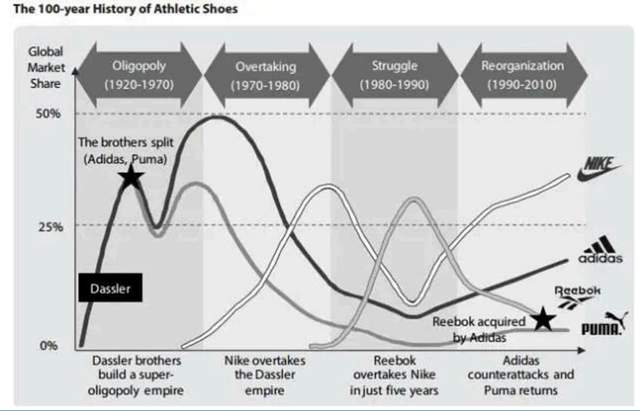 图:1920-2010年美国运动鞋市场主要品牌的更迭及市占率的变化 来源:Samsung Economic Research Institute