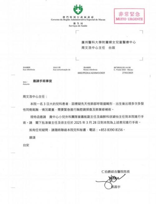 2025年3月28日的濠江之畔,一场跨越珠江口的生命接力悄然展开。应澳门特别行政区卫生局紧急求援,广州医科大学附属妇女儿童医疗中心主任周文浩启动应急响应机制,派遣胸外科曾嘉航主任、麻醉科徐颖怡主任前往澳门仁伯爵综合医院,为胎龄仅29周的超早产儿成功实施先天性多发支气管胸膜瘘修补术,用精湛医术续写穗澳医疗协作新篇章。