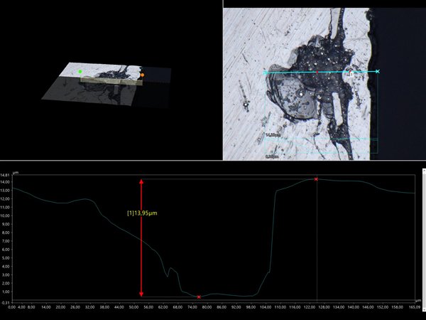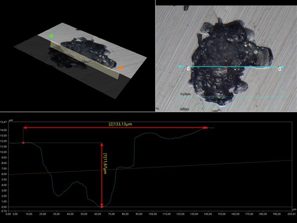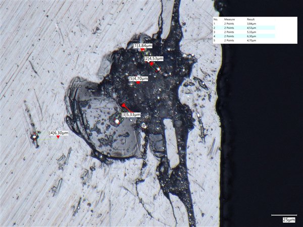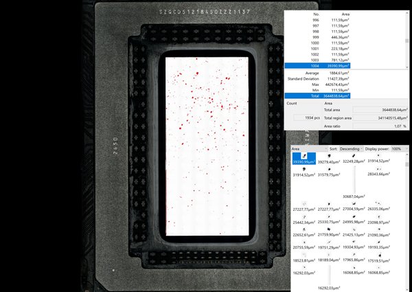 这些坑点合计占了GPU总面积的超过1%,最大的深度12.59微米、直径212.36微米,明显超标。