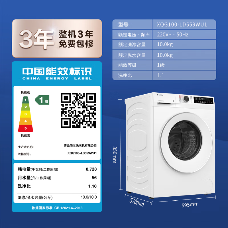 Leader海尔智家滚筒洗衣机XQG100-LD559WU1大10公斤一级能效