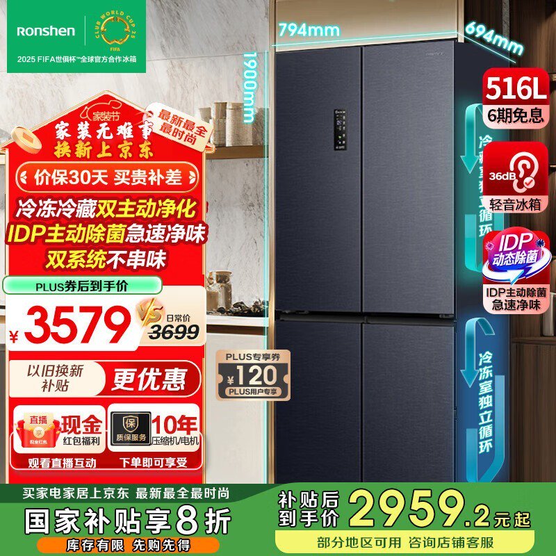 容声516升变频十字对开门冰箱一级能效京东好价2721.04