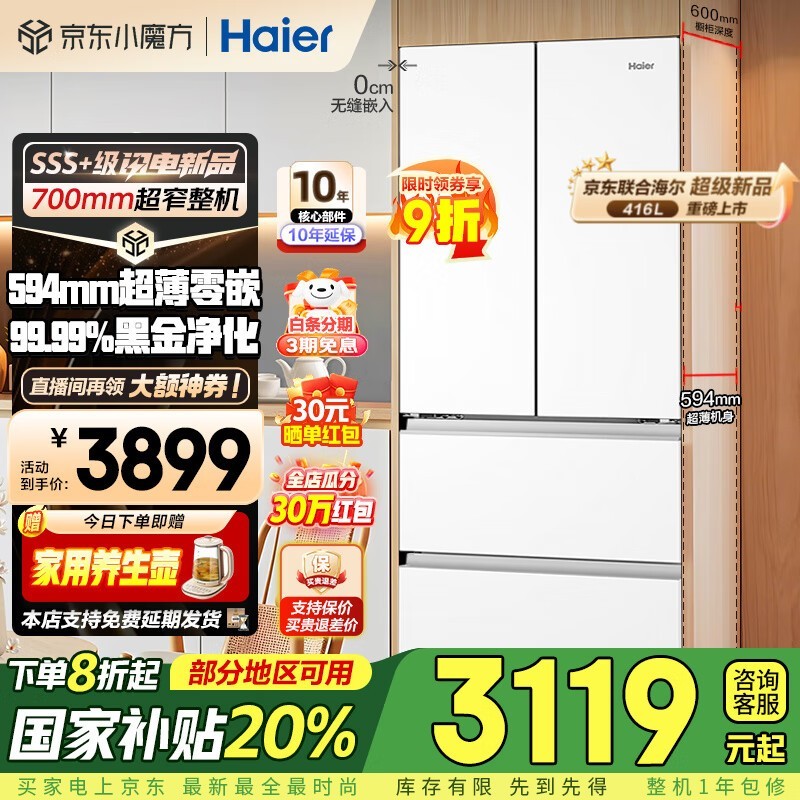海尔小红花冰箱416升超薄零嵌京东特惠2959元