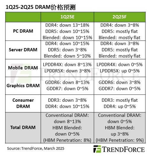 展望第二季度,不包含HBM在内的传统DRAM内存价格将趋于稳定,其中DDR5价格基本稳定不再下跌,DDR4内存在PC、服务器领域的价格降幅则预计收窄至3-8%,但在消费电子领域有望上涨0-5%。