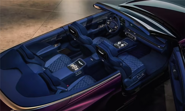 内饰方面,Coupe版本灵感源自地中海橄榄树,采用绿棕双色皮革,门板饰有橄榄叶纹样与复杂绗缝工艺;Convertible敞篷版本则以赤霞珠葡萄酒为灵感,通体覆盖蓝色皮革。