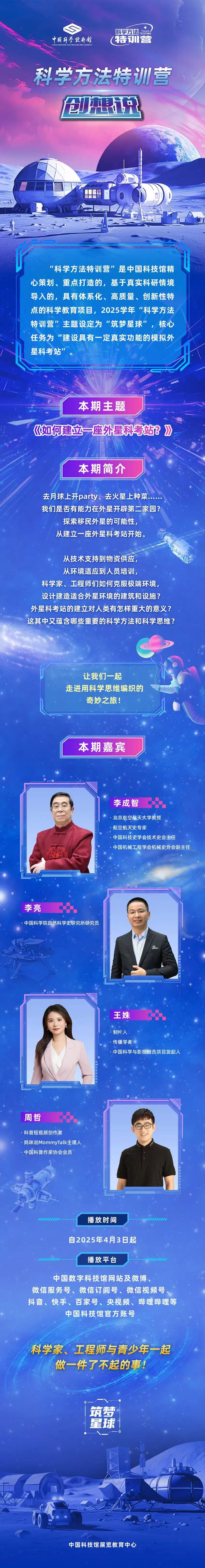 “科学方法特训营”是中国科技馆精心策划、重点打造的,基于真实科研情境导入的,具有体系化、高质量、创新性特点的科学教育项目,2025学年“科学方法特训营”主题设定为“筑梦星球”,核心任务为“建设具有一定真实功能的模拟外星科考站”
