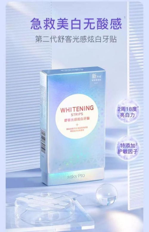 舒客光感炫白牙贴,采用了过氧化氢和木瓜蛋白酶双重亮白成分,能够软化牙垢,减少牙齿表面色素,实现高效亮白效果。与其他牙贴不同的是,舒客光感炫白牙贴配方温和,搭配舒缓因子,能在溶解牙渍的时候减少对于牙齿的刺激,缓解消费者牙齿酸的不适感。凭借出色的美白能力,该产品常居天猫美白牙贴榜TOP。