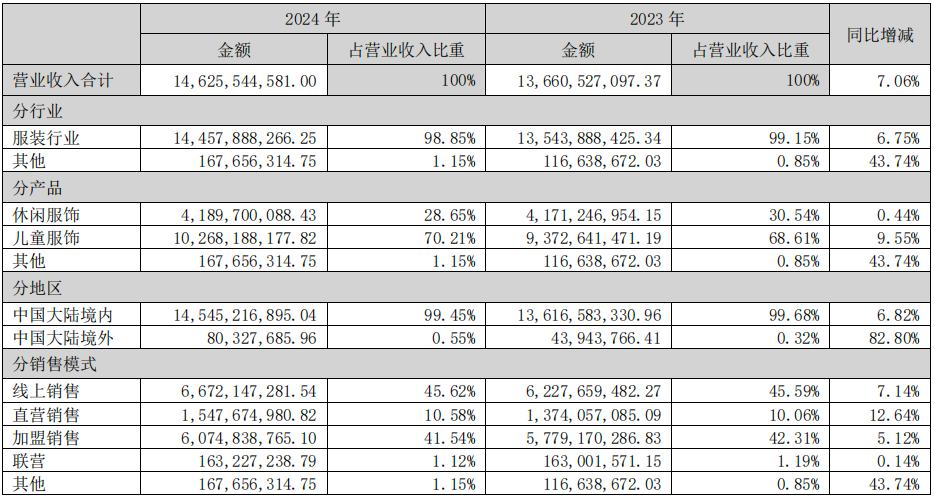 从产品来看,休闲服饰营收41.90亿,同比增长0.44%,占营收比重下降1.89%,为28.65%;儿童服饰营收102.68亿,同比增长9.55%,占营收比重上升1.6%,为70.21%。