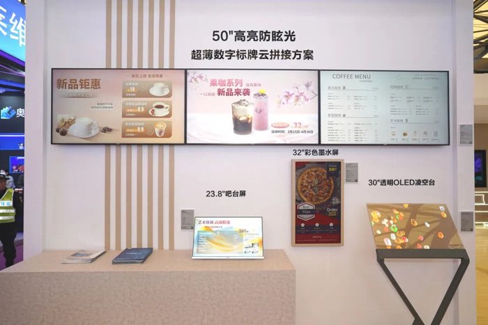 飞利浦深挖酒店附加潜能,提供专为酒店场景打造的吧台解决方案。通过50″高亮防眩光超薄数字标牌云拼接方案,联合吧台屏等构建屏幕矩阵,搭载CMS信发系统,打造集“点单、叫号、取餐”为一体化的吧台解决方案。同步展出的全彩墨水屏更能丰富零售展示,带来更清晰绚丽的视界,同时体现酒店致力绿色环保的企业责任,全面提升酒店品牌高度。