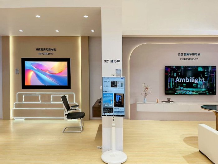 飞利浦构建全屋智慧生态,打造从视听享受到服务交互的无缝体验。飞利浦酒店客房专用电视,稳定耐用、智能云控,可结合不同酒店需求,定制化匹配管理系统,定制开机画面,打造酒店品牌形象,提升客人归家体验感,更为酒店降本增效。另外搭配智慧客控系统,全屋深度互联,实现从灯光、温控到服务的场景化自动响应,让宾客在私密空间中尽享沉浸式居住生活,诠释“科技隐于智慧”的奢居理念。会客厅配备酒店套房专用电视,与可触控可下棋娱乐的立式桌面圆形屏一体机、可随心移动一推即走的移动智慧屏进行创新组合,为会客空间增添更多趣味和灵活度,重塑空间高价值体验。