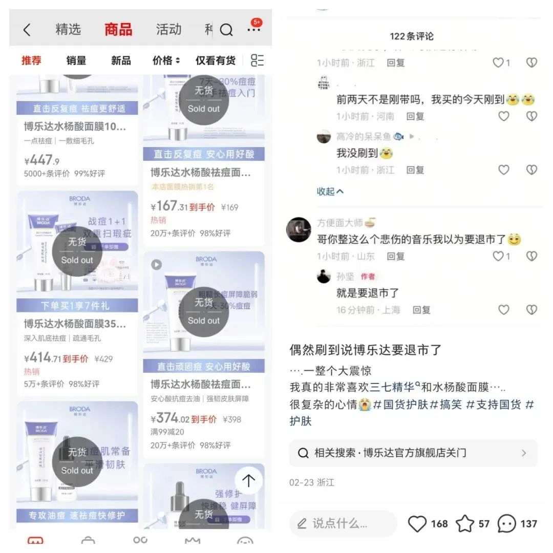 这对博乐达的品牌形象无疑造成了严重冲击,消费者信任度或在下降。社交平台上关于博乐达“售假”“退市”等负面猜测,消费者对其供应链稳定性产生质疑,同时也动摇了十多年来品牌构建的“科学循证”定位。