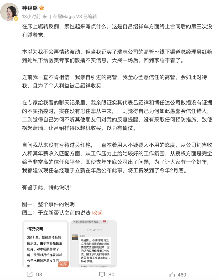 钟锦璐通过微博发文,指责吕绍祥 “过河拆桥”,称其通过收买瑞志公司高管(如线下渠道总经理吴红艳)传播不实信息,并利用合作协议漏洞绕过法律程序解除合作。而博乐达母公司则发布 “重新启航” 海报,暗示将进行团队重组,但未对纠纷细节作出正面回应。