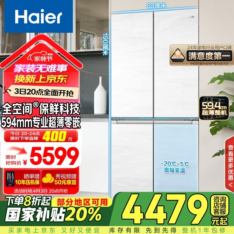 海尔475L十字门冰箱促销,到手价3397元