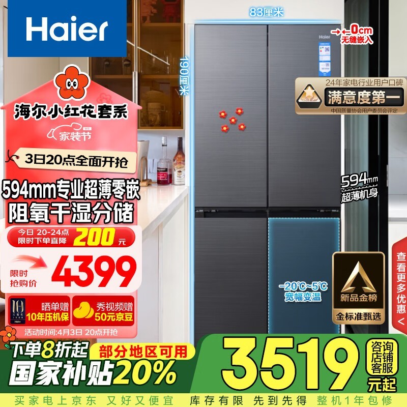 海尔472升十字四开门冰箱BCD-472WGHTDB9SYU1超薄嵌入式促销