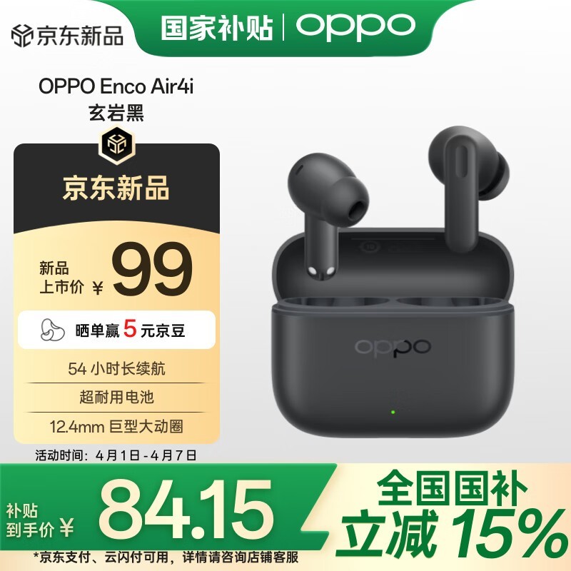 OPPO Enco Air4i真无线蓝牙耳机玄岩黑京东优惠价83.73元