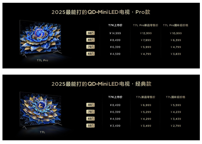 而且最关键的是,像TCL刚刚发布的两款新品,T7L和Q9L系列相较于去年同级别的K系列,可以说都是加量并且减价了,叠加国补,对于消费者而言几乎是买到就是赚。